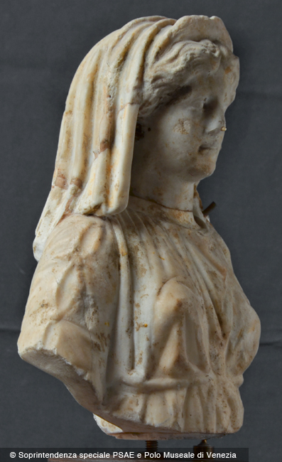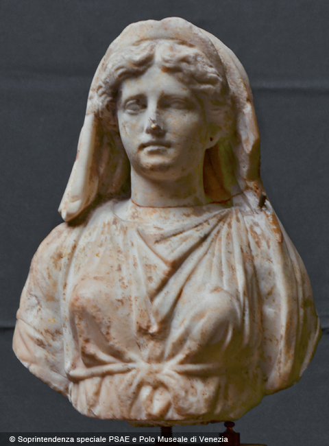 - Mythische Figur (Hera - Juno ?): Büste einer Göttin, Ärmelchiton, über den Kopf gezogener Mantel und Diadem.