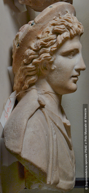 - Mythische Figur (Helios - Sol): Jünglingskopf mit langen Locken und Diadem mit Strahlen aus Metall. Büste bekleidet.