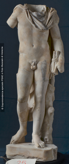 - Mythische Figur (?): stehender nackter Jüngling mit Mantel über Schultern und Rücken, in der gesenkten linken Hand Rest von zwei zusammengebundenen Stäben. Hinter dem linken Bein Baumstammstütze.