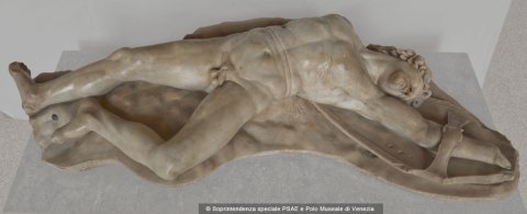 - Auf dem Rücken liegender nackter Gallier mit Schild am linken Arm. Kopie nach späthellenistischem Original aus Pergamon.