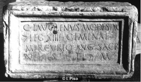- C(aius) Iavolenus Modestus / |(centurio) leg(ionis) XIII Geminae / Mercurio Aug(usto) sacr(um) / v(otum) s(olvit) l(ibens) m(erito)
