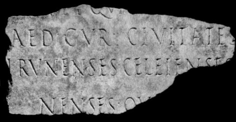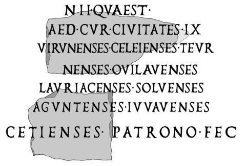 - ---] / [---]NI(?)I(?) qua[est(ori) ---] / aed(ili) cur(uli) civitates I[X] / [V]irunenses Celeienses [Teur]/nenses Ov[ilavenses] / [Lau]r[iacenses Solvenses] / Aguntense[s Iuvavenses] / [Ce]tienses [patrono fec(erunt)?]