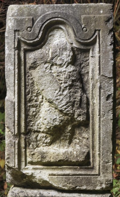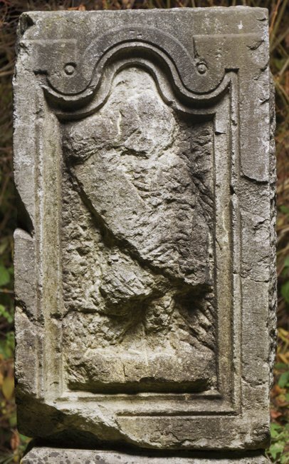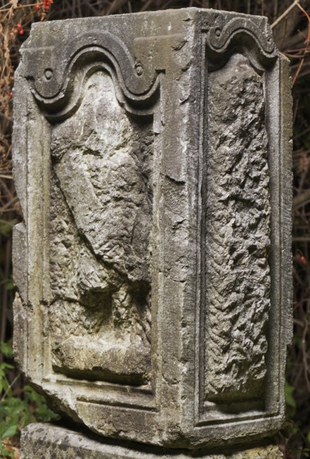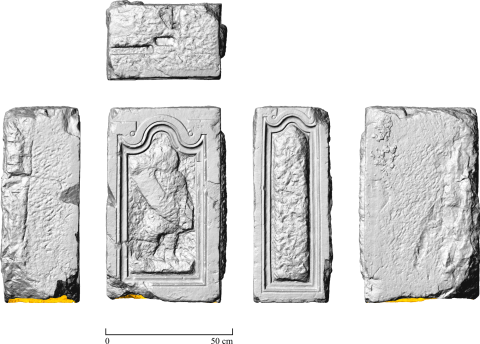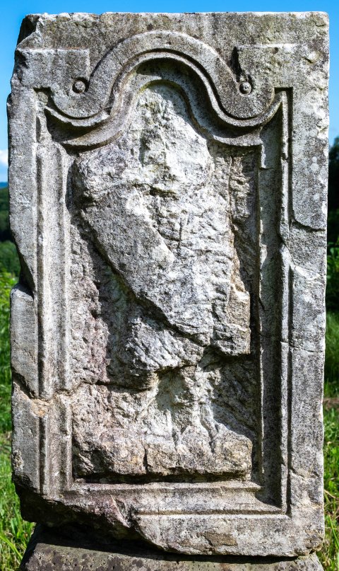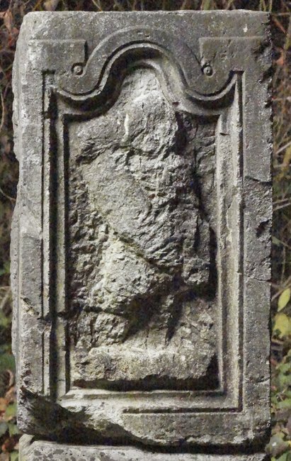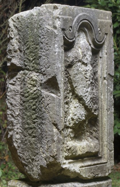 - Eckblock: auf der Vorderseite als Bosse ausgearbeiteter Librarius - Scriba mit geöffneter Rolle (volumen), rechte Nebenseite bossiert. Beide Seiten mit profiliertem Rahmen und Bogenabschluss mit Volutenenden.