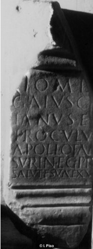 - I(ovi) O(ptimo) M(aximo) D(olicheno) / Gaius G[a]/ianus e[t] / Proculu[s] / Apollofan[es] / Suri neg(otiatores) pr[o] / salute sua ex v[oto]