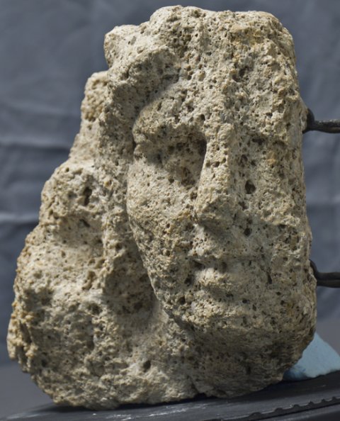 - Idealtypischer Frauenkopf mit langen Locken. Unten Rest eines runden Randes (Medaillon ?).