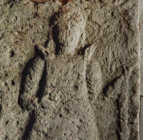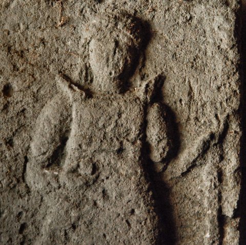 - Einheimische Frau (Dienerin ?): frontal stehende Ganzfigur mit Ober- und Untergewand, Fibeln, Gürtel, in der Rechten Apfel(?), in der Linken Spindel.