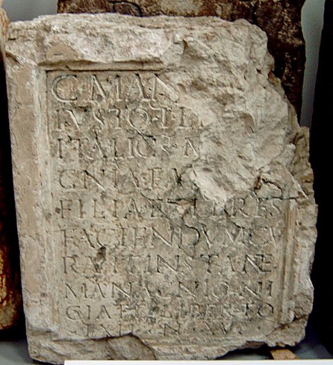 - C(aio) Managnio / Iusto |(centurioni) leg(ionis) III / Italic(ae) Mana/gnia Fabiana / filia et heres / faciendum cu/ravit(!) instante / Managnio Ni/ciate liberto / ex H(S) n(ummum) XVI(milibus)