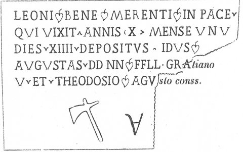 - [Le]oni ben[e merenti in pace] / [qui] vixit a[nnis X mense unu(!)] / [dies] XIIII d[epositus Idus] / [Augu]st[as dd(omini) nn(ostri) FFll(avi) Gratiano / V et Theodosio A(u)gusto conss(ulibus)]