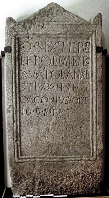 - Q(uintus) Sextilius / L(ucii) f(ilius) Pol(lia) mil(les) leg(ionis) / XV Apol(linaris) an(norum) XL / stip(endiorum) XX h(ic) s(itus) e(st) / C(aius) Aconius opt/io d(e) s(uo) p(osuit)