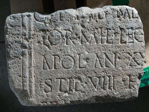 - ---] / Q(uinti) f(ilius) Pub(lilia) Me[rca]/tor mil(es) le[g(ionis) XV] / Apol(linaris) an(norum)XX[VII?] / stip(endiorum) VIII h(ic) [s(itus) e(st] / Sp[- - -] / [---