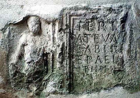 - Im linken Seitenfeld mit Bogennische Ganzfigur eines Mannes (Soldat): Sagum, Scheibenfibel. Waffen: Lanze in der Linken, an der linken Hüfte Schwert in Scheide mit Dosenortband, die Rechte auf Schild gestützt.