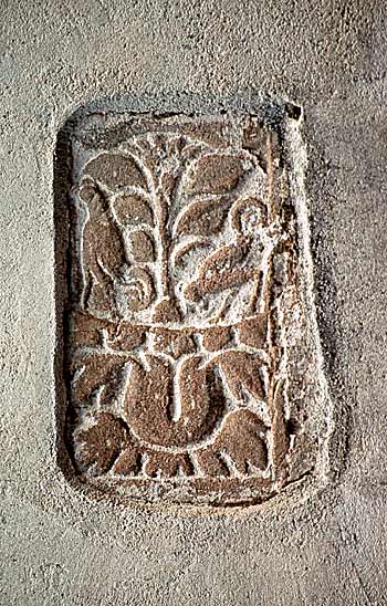 - Tiere : Schmales Bildfeld mit Akanthuskelch, aus dem Pflanze wächst, rechts und links je ein Vogel (Reiher mit Schlange im Schnabel ?).