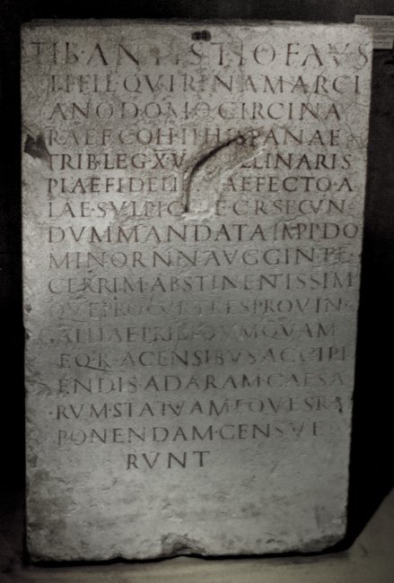 - Tib(erio) Antistio Faus/ti fil(io) Quirina Marci/ano domo Circina / praef(ecto) coh(ortis) II Hispanae / trib(uno) leg(ionis) XV [Apo]llinaris / Piae Fideli[s pr]aefecto a/lae Sulpic[i]ae c(ivium) R(omanorum) secun/dum mandata Impp(eratorum) do/minor(um) nn(ostrorum) Augg(ustorum) inte/gerrim(o) abstinentissimo/que procur(atori) tres provinc(iae) / Galliae primo umquam / eq(uiti) R(omano) a censibus accipi/endis ad aram Caesa/rum statuam equestrem / ponendam censue/runt