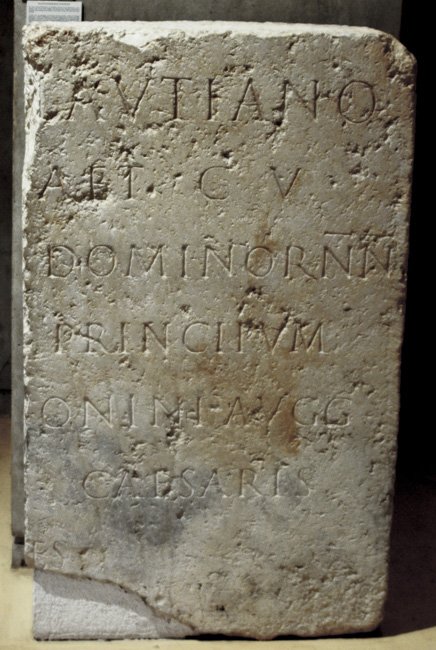 - [C(aio) Fulvio P]lautiano / [praef(ecto) pr]aet(orio) c(larissimo) v(iro) / [co(n)s(uli) II adfini?] dominor(um) nn(ostrorum) / [---] principum / [Severi et Ant]onini Augg(ustorum) / [et Getae nob(ilissimi)] Caesaris / [t]res / [provinciae Galliae