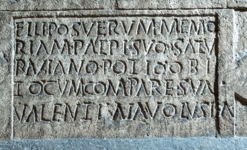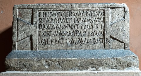 - Fili(i) posuerum(t)(!) / memo/riam patri suo Satu/rniano Potio obi/to cum compare sua / Valentina Volusia