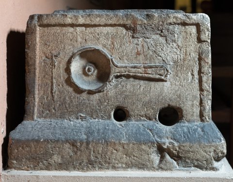- Inschrift in tabula ansata. Auf den Nebenseiten Werkzeug (ascia) und patera.