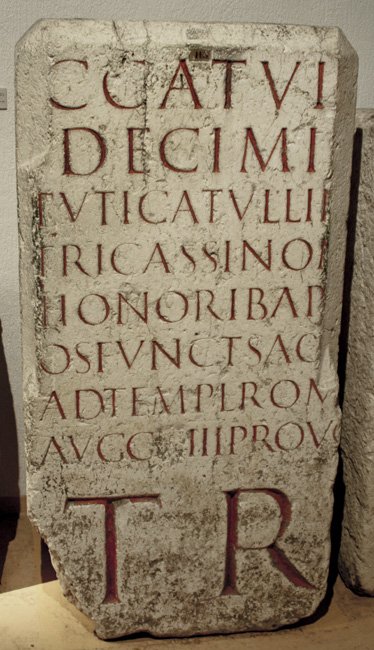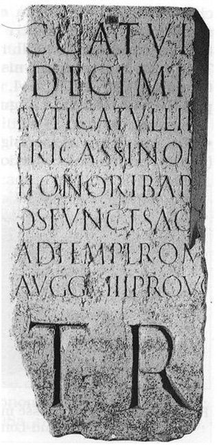 - C(aio) Catul[l]io / Decimi[n]io / Tuti Catullin[i] fil(io) / Tricassin(o) omnib(us) / honorib(us) ap[u]d su/os funct(o) sac[e]rd(oti) / ad templ(um) Rom(ae) et / Augg[[g(ustorum)]] III prov(inciae) Gall(iae) // Iunia[e] / Domitiol[ae] / uxori [C(ai)] / Catull[i] / Decimin[i] // tres pr[ov(inciae) Galliae