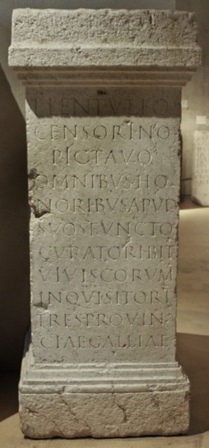 - L(ucio) Lentulio / Censorino / Pictavo / omnibus ho/noribus apud / suos functo / curatori Bit(urigum) / Viviscorum / inquisitori / tres provinc/iae Galliae