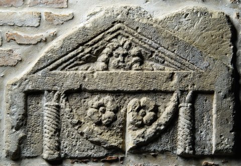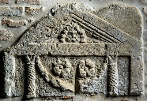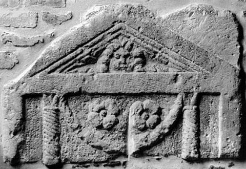 Im Giebel Gorgoneion (Maske ?) zwischen Blättern.