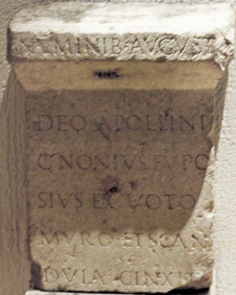 - Numinib(us) August(orum) // deo Apollini / C(aius) Nonius Eupo/sius ex voto / muro et scan/dula cinxit