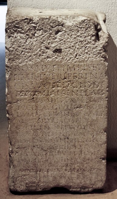 - Pro salute Imp(eratoris) L(uci) Sep/timi Severi Pertina/cis Aug(usti) et D(ecimi) Clodi / [[Septimi Albini Caes(aris)]] / domusq(ue) divinae et statu c(oloniae) C(opiae) C(laudiae) Aug(ustae) Lug(udunum) / taurobo/lium fecerunt Aufustia / Alexandria et Sergia / Parthenope ex voto / praeeunte Aelio Castren/se sacerdote tibicine Fl(avio) / Restituto inchoatum est / sacrum VII Idus Mai(as) con/summatum V Id(us) easdem / [I]mp(eratore) L(ucio) Septimio Severo Pertinac(e) Aug(usto) / [[[D(ecimo) Clod(io) Sept(imio) Albino Caes(are)]]] / II co(n)s(ulibus) / [l(ocus)] d(atus) [d(ecreto) d(ecurionum)]