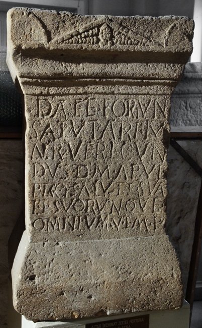 - D(e)ae{e} Fortun(ae) / Salutari M(arcus) / Aur(elius) Verecun/dus d(ecurio) m(unicipii) Apul(ensis) / pro salute sua / et suoru<m=N>que / omnium v(otum) l(ibens) m(erito) p(osuit)