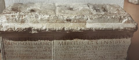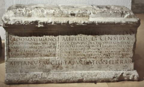 - C(aio) Iul(io) C(ai) fil(io) Quir(ina) / Celso Maximiano / adlecto annorum quattuor / in amplissimum ordinem / ab Imp(eratore) T(ito) Aelio Hadriano / Antonino Aug(usto) Pio p(atre) p(atriae) // C(aio) Iul(io) C(ai) fil(io) Quir(ina) Celso / a libellis et censibus / proc(uratori) provinciar(um) Lugud(unensis) et Aquitanic(ae) / proc(uratori) patrimoni proc(uratori) XX hereditat(ium) Roma[e] / proc(uratori) Neaspoleos et Mausolei Alexandriae proc(uratori) / XX heredit(atium) per provincias Narbonens(em) / et Aquitanicam dilectatori per Aquitanica[e] / XI populos curatori viae lignariae triumphal[is] / Appianus Aug(usti) lib(ertus) tabul(arius) ration(is) ferrar(iarum)