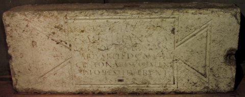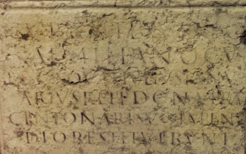 - Curante Fulvio / Aemiliano c(larissimo) v(iro) / loca quae Iulius Ianu/arius rei p(ublicae) donaverat / centonari(i) suo impen/dio restituerunt