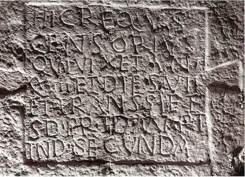 - Hic req(uiescit) v(ir) s(pectabilis) / Censorius / qui vixet (!) an(nos) / LXIIII et dies VII / et transiet / s(ub) d(ie) pr(idie) id(us) Mart(ias) / ind(ictione) secunda