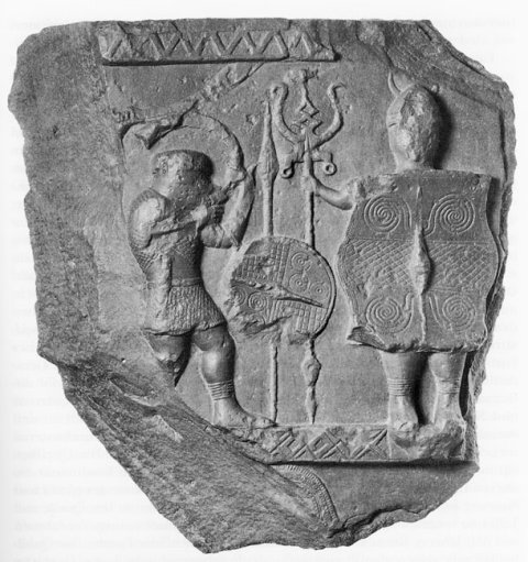 - Mythische Figur, Musikinstrument: Friesfragment mit Zackenband oben und unten. Rechts frontal stehende Gottheit mit hohen Schuhen und Waffen (Hörnerhelm, Schild), in der Rechten Standarte. In der Mitte senkrecht aufgepflanzte Lanze, an der Rundschild hängt. Links davon nach rechts gewandter Hornbläser in kurzem Gewand mit Gürtel, Dolch, hohen Schuhen. Unten Rest eines weiteren Relieffrieses (Helm ?).