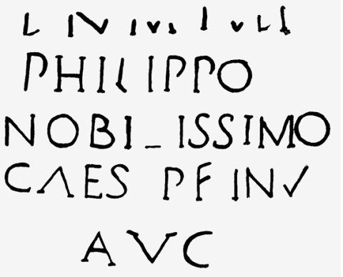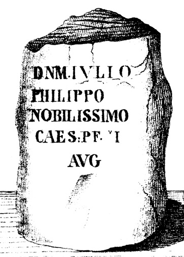 - D(omino) n(ostro) M(arco) Iulio / Philippo / nobilissimo / Caes(ari) P(io) F(elici) Inv(icto) / Aug(usto)