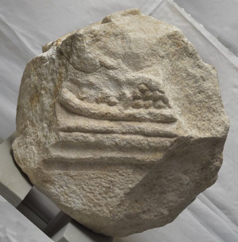 - Profilierter Rahmen, daneben Rest einer Ranke mit Blüte.