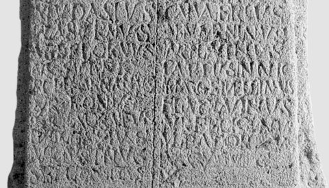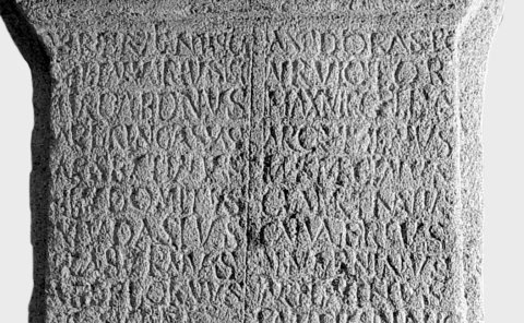 - G(enio) c(ohortis?) / I(ovi) O(ptimo) M(aximo) // pro sal(ute) Aug(usti) // Ulp(ius) Repentinus c(en)t(urio) / [I]ul(ius) Ianuarius s(ingularis) c(onsularis) / Aur(elius) Cabdnus / Aur(elius) Brincasus / Aur(elius) Se(x)tianus / SLV Domitus / SIV Dasius / Fla(vius) Surianus / Sep(timius) Florianus / Aur(elius) Super / Ulp(ius) Renanus / Aur(elius) Lonus / [Au]r(elius) Exoratus / Iul(ius) Messius / U(l)p(ius) Iustinus / Sep(timius) Constans // Ant(onius) Doras PC / Aur(elius) Victor / Max(imus) M(a)rcellus / Aur(elius) Quirinus / Mar(cus) Mecianus / Cl(audius) Strenuus / Can() Valerius / [---] Saturninus / Aur(elius) Flavinus / Pap[---]tu Sinnio / Fla(vius) Gemellinus / Fla(vius) Flavinus / Aur(elius) Felicianus / Ulp(ius) Atorius / Au[r(elius)] Qu[---]s