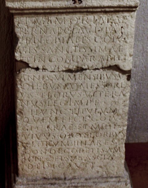 - D(is) M(anibus) // et memoriae ae/ternae Claudiae / Felicitatis co(n)iu/gis sanctissimae / et incomparabili(s) / quae vixit cum eo / annis VI mensibus V / diebus XV Messori/us Florus vetera/nus leg(ionis) I M(inerviae) P(iae) F(idelis) / hunc titulum / quem feci co(n)iu/gi carae et mihi / vivus oro flor(i)bus / Florum hilares / condecoretis am/ici p(onendum) c(uravit) et sub ascia dedicavit