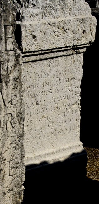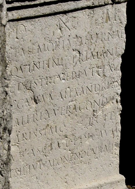 - D(is) M(anibus) / et memoriae aeternae / Quintini Primani / civis Treveri vet(erani) ex / leg(ione) XXX U(lpia) V(ictrice) Alexandrian(a) / Valeria Vera coniugi / karissimo p(onendum) c(uravit) et / sub ascia dedicavit / et sibi viva ponend(um) curavit
