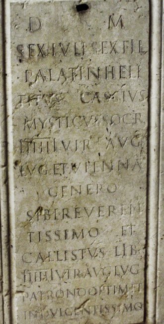 - D(is) M(anibus) / Sex(ti) Iuli Sex(ti) fil(ii) / Palatin(a) Heli / Titus Cassius / Mysticus socer / IIIIIIvir Aug(ustalis) / Lug(uduni) et Viennae / genero / sibi reveren/tissimo et / Callistus lib(ertus) / IIIIIIvir Aug(ustalis) Lug(uduni) / patrono optim(o) et / indulgentissimo