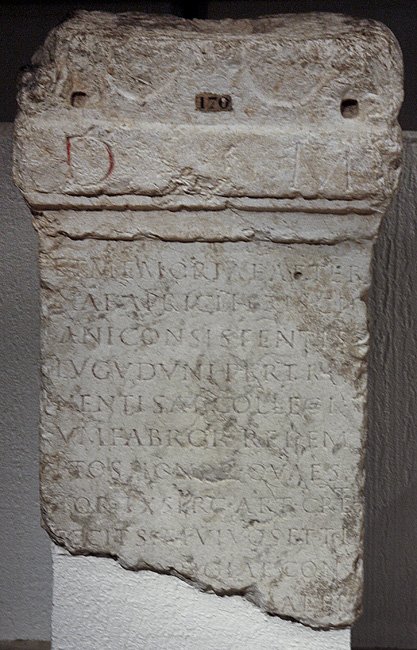 - D(is) M(anibus) // et memoriae aeter/nae Apricli Prisci/ani consistentis / Luguduni perti/nentis ad collegi/um fabror(um) redem/pto s(ibi?) honor(e) quaes/tor(io) exserc(entis) art(em) cret(ariam) / fecit sibi vivos et Ti/[--- A]piolae(?) con/[iugi carissi]mae et / [---