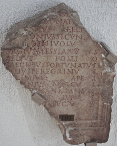 - ---]OT[---] / [---] Donat[anus?] / [Clau]dius(?) Feli[cio?] / [---]onius Secund[us] / [---] Benivolus / Orgius Messianus / Aelius Pollio / Caecilius Fortunatus / [I]ulius Peregrinus / [De]cimius Aper / [---]minius Marcus / [---]us Sabinianus / [---]s Lupus / [---]eucius
