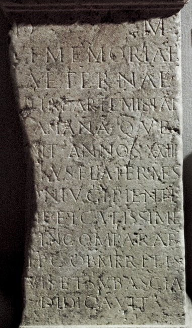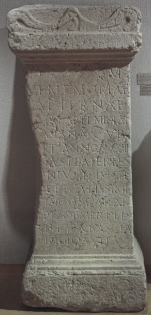 - Chere(!) Hygiene(!) // D(is) M(anibus) / et memoriae / aeternae / [I]uliae Artemisiae / [n(atione)] Asiana qu(a)e / [vi]xit annos XXIIII / [Ti]tus Fla(vius) Hermes / [c]oniugi pientis/[si]m(a)e et castissim(a)e / [e]t incomparabi/[l]i p(onendum) c(uravit) ob meritis(!) / [s]uis(!) et sub ascia / d<e=I>dicavit