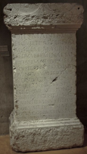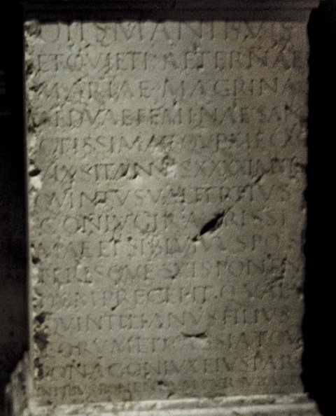 - Diis(!) Manibus / et quieti aeternae / Mariae Macrinae / (H)aeduae feminae san/ctissimae qu(a)e mecum / vix{s}it annis XXXXI m(ensibus) VIII / Quintus Val(erius) Tertius / coniugi rarissi/mae et sibi vivus pos/terisque suis ponen/dum precepit Q(uintus) Val(erius) / Quintilianus filius / eorum et Cassia Tou/tona coniux eius pare/ntibus ponendum cur(averunt) sub as(cia) d(edicaverunt)