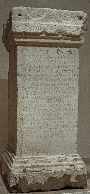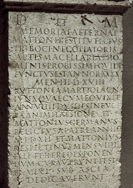 - D(is) M(anibus) / et / memoriae aeternae / Mattoni Restituti civis / Triboci negotiatoris / artis macellariae ho/minis probissimi qui de/functus est annor(um) XXXX / men(sium) III d(ierum) XVIII / Ruttonia Martiola con/iunx quae cum eo vixit / ann(os) VIIII d(ies) VIIII sine ul/la animi laesione et / Mattonius Germanus / relictus a patre ann(orum) III / m(ensis) I d(ierum) XII et Mattonius / Respectinus mens(ium) VIIII / fili(i) et heredes ponen/dum curaverunt et si/bi vivi sub ascia / dedicaverunt