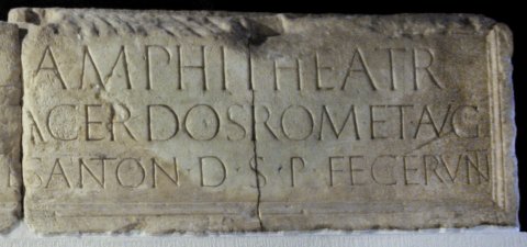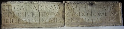 - [Pro salut]e(?) Ti(beri) Caesaris Aug(usti) amphitheatr(um) / [--- p]odio C(aius) Iul(ius) C(ai) f(ilius) Rufus sacerdos Rom(ae) et Aug(ustorum) / [---] filii f(ilius) et nepos ex civitate Santon(um) d(e) s(ua) p(ecunia) fecerunt