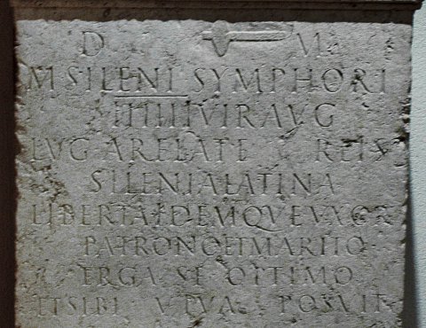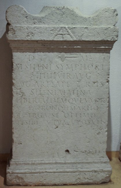 - D(is) M(anibus) / M(arci) Sileni Symphori / IIIIIIvir(i) Aug(ustalis) / Lug(duni) Arelate Reis / Silenia Latina / liberta idemque uxor / patrono et marito / erga se optimo / et sibi viva posuit
