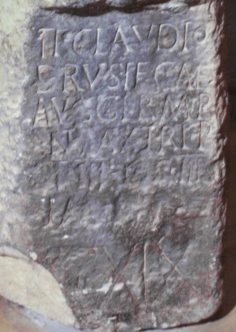 - Ti(berio) Claudio / Drusi f(ilio) Caes(ari) / Aug(usto) Germ(anico) p/ont(ifici) max(imo) trib(unicia) p/ot(estate) III co(n)s(uli) III / imp(eratori) [p(atri)] p(atriae / XIX