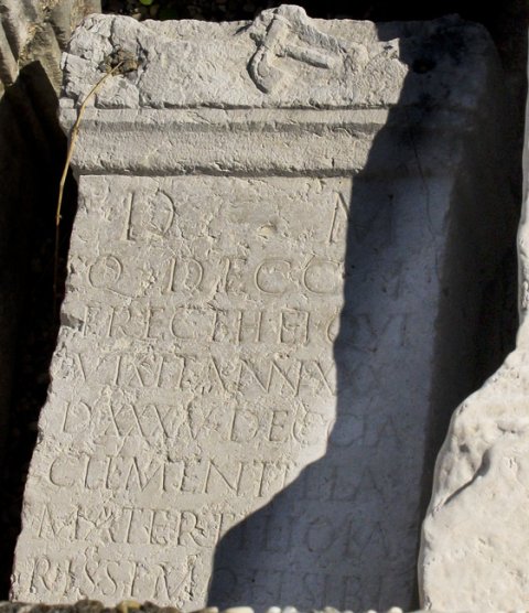 - D(is) M(anibus) / Q(uinti) Decci / Erecthei qui / vixit ann(os) XXX / d(ies) XXXV Deccia / Clementilla mater filio ka/rissimo et sibi / p(onendum) c(uravit) et s(ub) a(scia) d(edicavit)
