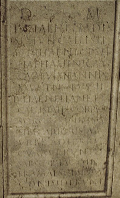 - D(is) M(anibus) / Iuliae Heliadis / Sex(ti) Iuli Callisti / et Iuliae Nices fi/liae flaminic(ae) Aug(ustae) / quae vixit annis / XXV mensibus II / Iuliae Heliane et / Callistate corpus / sororis anima sua / sibi carioris ab urbe adferri / curaverunt et / sarcophago in/tra maesolaeum(!) / condiderunt