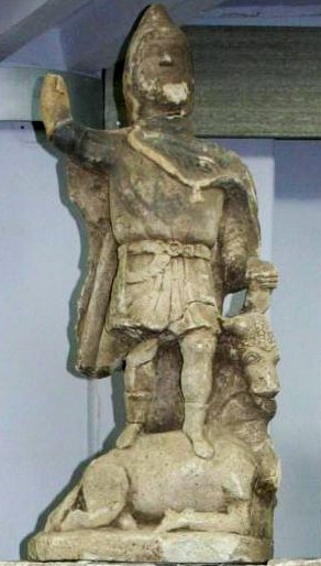 - Mythische Figur: auf einem liegenden Stier stehender Jupiter Dolichenus mit phrygischer Mütze, Sagum, Gürtel mit Ringschnalle, Stiefeln.