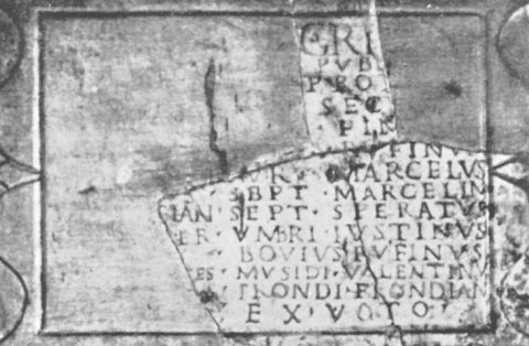 - ---]us / [---]eian(us) / [---]er() / [---]s / [---]tes / [---]us // ]M[---] / [---]cori[---] / [---] Publ[---] / [---] Prot[---] / [---] Secu[nd ---] / [---] Fin[---] / [---] Rufinus [---] / Aur(elius) Marcel(l)us / Sept(imius) Marcel(l)inus / Sept(imius) Speratus / Umbri(us) Iustinus / Bovius Rufinus / Musidi(us) Valentinus / Frondi(us) Frondian(us) / ex voto