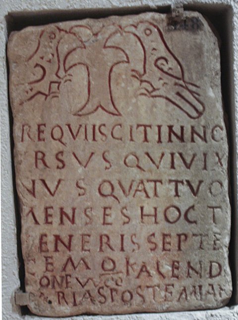 - über der Inschrift Ritzzeichnung einer Pflanze (Palme ?) zwischen zwei Tauben