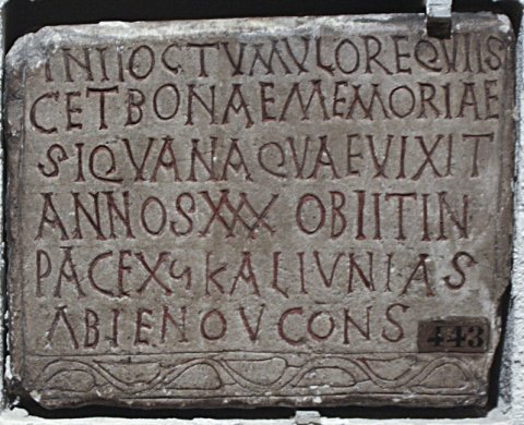 - In hoc tumulo requiis/cet(!) bonae memoriae / Siquana quae vixit / annos XXX obiit in / pace XVI Kal(endas) Iunias / Abieno v(iro) (!) cons(ule)